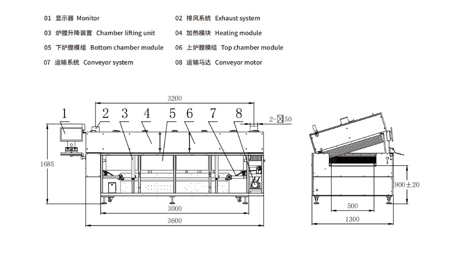 | 1.可選:機頭機尾可凸出,凸出上爐膛外側面尺寸300mm(整機尺寸會加長600mm)。 2.注明:根據產能要求,推薦溫區(qū)數量優(yōu)先選擇:4溫區(qū)、5溫區(qū)、 8溫區(qū)、9溫區(qū)、10溫區(qū)、12溫區(qū),可定制。 | |||
