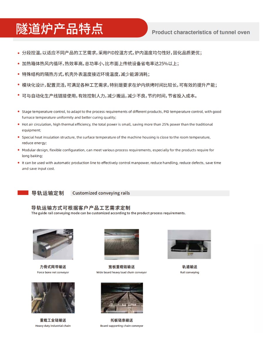 SHR-01L系列隧道爐由機架系統、熱風循環(huán)系統、輸送系統、加熱系統及電氣控制系統等組成。精選優(yōu)質不銹鋼力骨式網帶,耐磨性好,使用壽命長,運轉平衡。采用模塊化、數字化及人性化設計,在功能、性能、穩(wěn)定性及可靠性、安全性、可維護性、易操作性方面具有良好的優(yōu)越性,既為客戶降低了運營成本,也為客戶保質保量生產合格的產品提供了有力的保障。力骨式網帶輸送方式,可應對多種形式的產品輸送,特別適合體積小、數量多的產品生產需求,產品可靈活排布在網帶上,設備可配合自動化上下料機構使用。