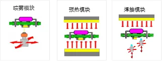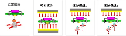 預熱模塊由底部預熱、頂部預熱、焊接保溫模塊組成。各溫區獨立循環、獨立控溫??筛鶕a品尺寸,自動關閉產品尺寸范圍外的加熱,節能簡單。