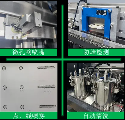 采用微孔滴噴嘴,130um直徑,噴射范圍2~8mm。伺服電機運動控制,點對點式噴射,大量節約助焊劑使用,噴射精度±0.25mm。標配噴嘴防堵檢測、自動清洗功能。