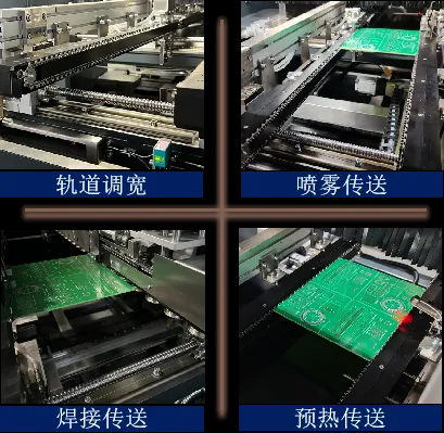 傳送模塊由噴霧傳送、預熱傳送、焊接傳送三部分組成。適用于傳送工藝邊3mm以上。噴霧和焊接傳送軌道上分別裝有停板定位裝置,確保噴霧及焊接精度。焊接傳送采用滾輪設計,有效防止高溫形變。
