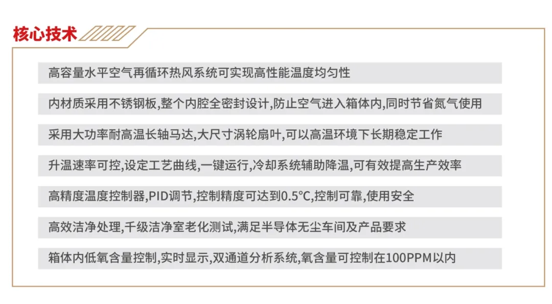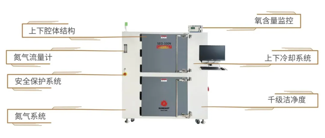 日東科技SEO系列半導(dǎo)體充氮烤箱通用性強(qiáng),通過充入氮氣將烤箱中的氧氣排出,防止烘烤高溫產(chǎn)生氧化現(xiàn)象。設(shè)備采用高容量水平空氣再循環(huán)系統(tǒng),采用專有的腔室結(jié)構(gòu)和密封技術(shù),具有出色的氣密性和溫度均勻性,滿足半導(dǎo)體產(chǎn)品高性能要求,適用于固化半導(dǎo)體晶圓、IC封裝(銅基板,銀膠,硅膠,環(huán)氧樹脂)、玻璃基板等產(chǎn)品烘烤。
