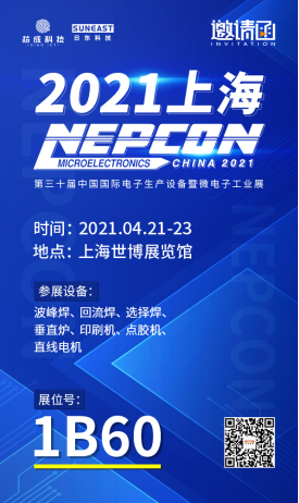 NEPCON China 2021(第三十屆中國國際電子生產(chǎn)設(shè)備暨微電子工業(yè)展覽會)將于4月21-23日在上海世博展覽館隆重開幕。作為電子制造業(yè)的國際盛會,本屆展會將聚焦于表面貼裝技術(shù)(SMT)、焊錫與點(diǎn)膠、測試與測量、新型電子材料等設(shè)備與技術(shù)的展示。