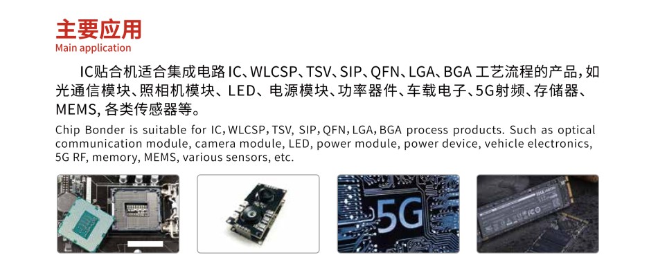 IC貼合機主要應用:IC貼合機適合集成電路IC、WL CSP、TSV、SIP、QFN、LGA、BGA工藝流程的產品, 如光通信模塊、照相機模塊、LED、電源模塊、功率器件、車載電子、5G射頻、存儲器、MEMS, 各類傳感器等。