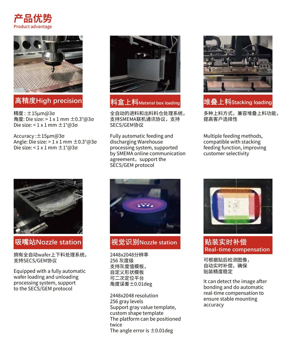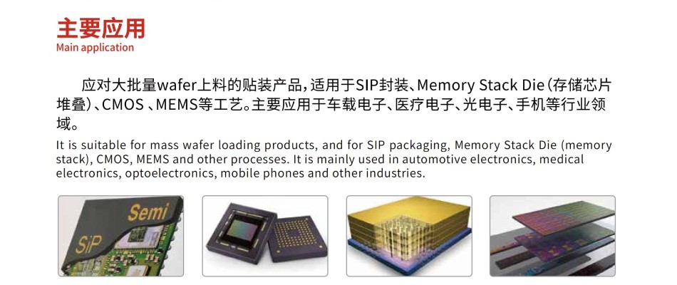 通用型高精度芯片貼合機(jī),應(yīng)對大批量wafer上料的貼裝產(chǎn)品,適用于SIP封裝、Memory Stack Die(存儲芯片堆疊)、CMOS 、MEMS等工藝。