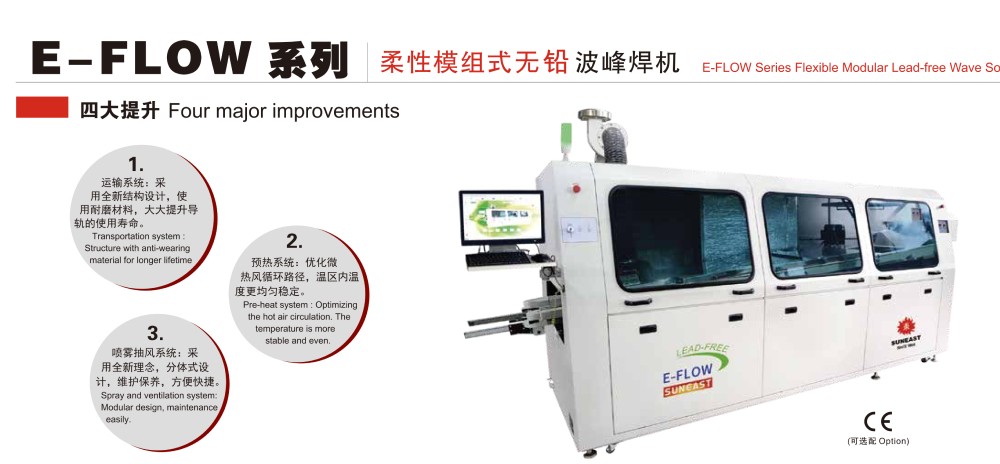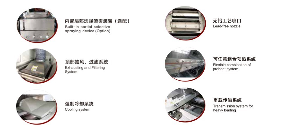 預熱系統(tǒng):優(yōu)化微熱風循環(huán)路徑,溫區(qū)內溫度更均勻穩(wěn)定;噴霧抽風系統(tǒng):采用全新理念,分體式設計,維護保養(yǎng),方便快捷;內置局部選擇噴霧裝置(選配):是步進電機通過同步帶及滾珠絲桿,直線導軌等作X和Y方向的運動來實現(xiàn)局部選擇噴涂助焊劑。